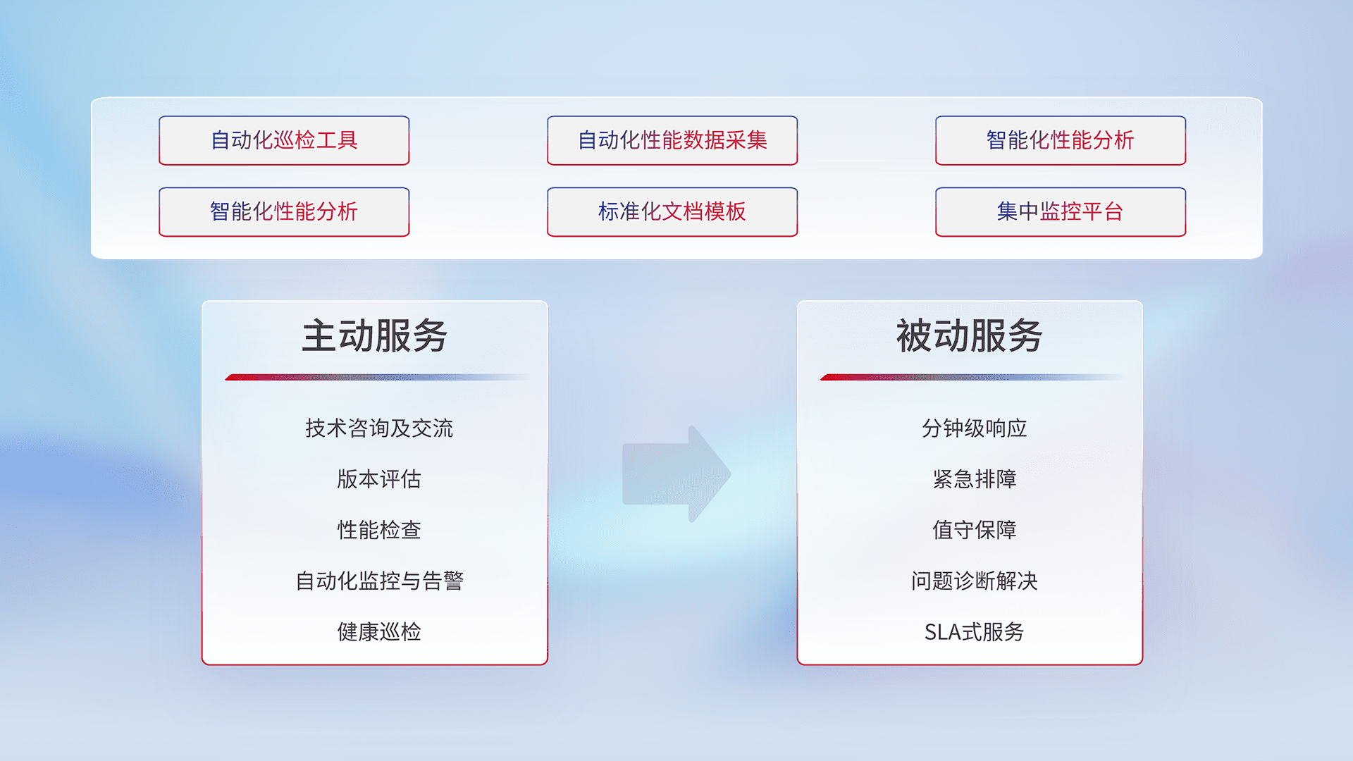 智能化工具和标准化文档,,,保障服务质量,,,,提供主动服务(包含技术咨询、、、版本评估、、性能检查、、自动化监控与告警、、、、健康巡检)和被动服务包含(分钟级响应、、、、紧急排障、、、、值守保障、、、、问题诊断解决、、、SLA服务)。。。